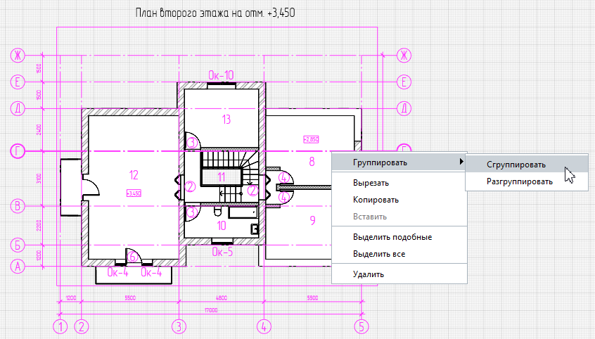 В Renga предусмотрено объединение выбранных объектов чертежа в группы и снятие объединения. Это можно сделать с помощью действий меню Группировать → Сгруппировать  и Разгруппировать . Действия доступны из контекстного меню, с панели Действия или с помощью комбинаций клавиш Ctrl+G/Ctrl+Shift+G.