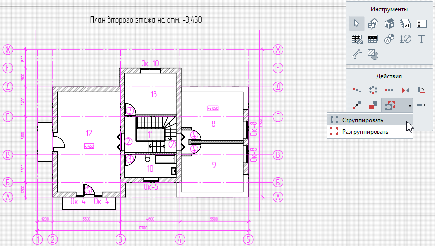 • Из контекстного меню или на панели Действия выберите Группировать- Сгруппировать, для выбора действия также можно воспользоваться комбинацией клавиш Ctrl+G.