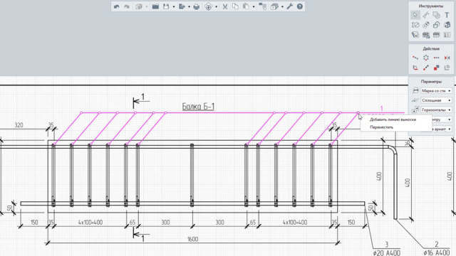 Если в чертёж вставлено арматурное изделие, то с помощью обозначения Маркер можно автоматически проставить позиции арматурных стержней, из которых оно составлено.