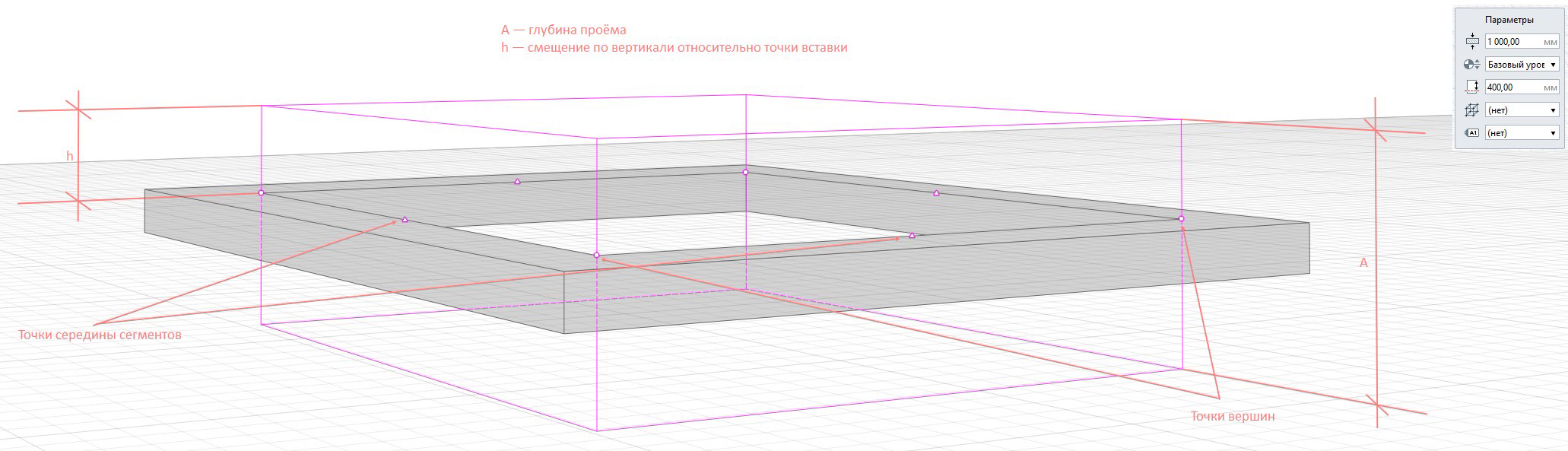 Смещение по вертикали. Определяет смещение проёма по вертикали относительно точки вставки. Проём строится вниз от точки вставки, т.е., если вам нужно привязать низ проёма к уровню или точке вставки, то введите в это поле значение глубины проёма. Стройте проём в режиме измерения Полярный или Прямоугольный, чтобы поле Смещение по вертикали отражало смещение от уровня.